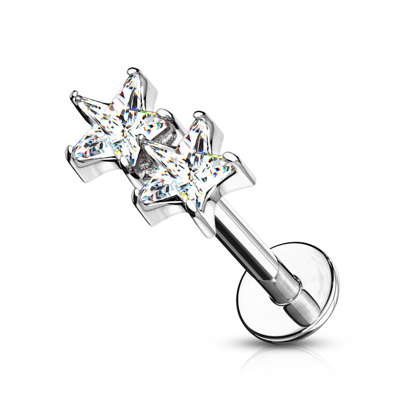 Quoi de mieux qu'une étoile ? Deux étoiles, bien sûr ! C'est exactement ce que vous avez avec ce sublime labret. Ajoute ce bijou à tes piercings à l'oreille et tout le monde aura les yeux rivés sur le scintillement des étoiles. Ce labret est muni d'un filetage interne, ce qui est bien plus confortable qu'un bijou muni d'un filetage externe lorsqu'il s'agit d'insérer le bijou dans ton trou de piercing.