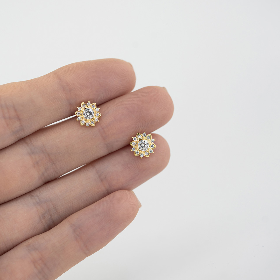 Le design de la partie supérieure est une fleur de lotus en laiton. L'ensemble du bijou dispose d'un revêtement. Tu peux donc choisir entre plusieurs couleurs différentes : or, or rose et argenté. La fleur de lotus mesure 8 mm et est ornée de plusieurs pierres transparentes sur le pourtour ainsi que d'une pierre à facettes en son centre qui mesure 3,5 mm.