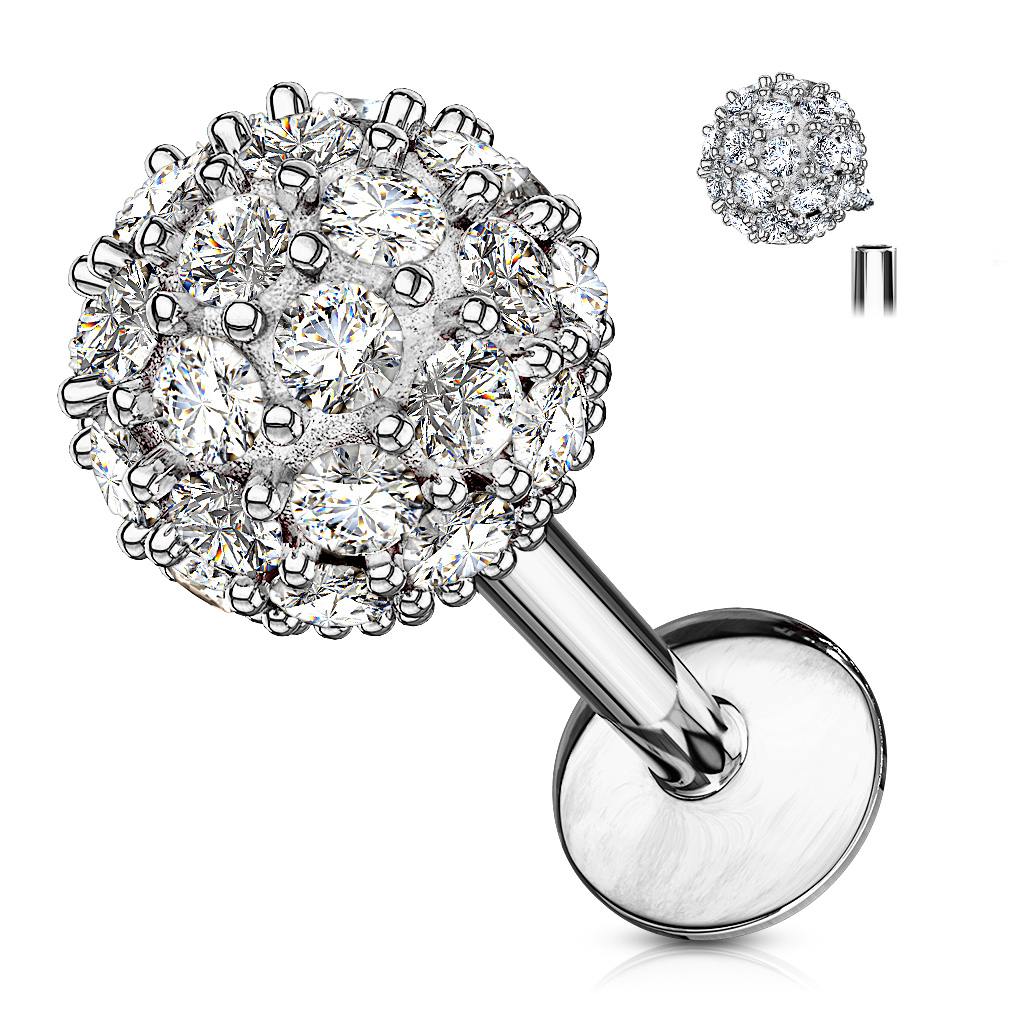 Ce labret possède une énorme boule de 6 mm de diamètre. La boule est ornée de petites pierres transparentes qui brillent de mille feux. Avec ce bijou, tu seras le centre de toutes les attentions.