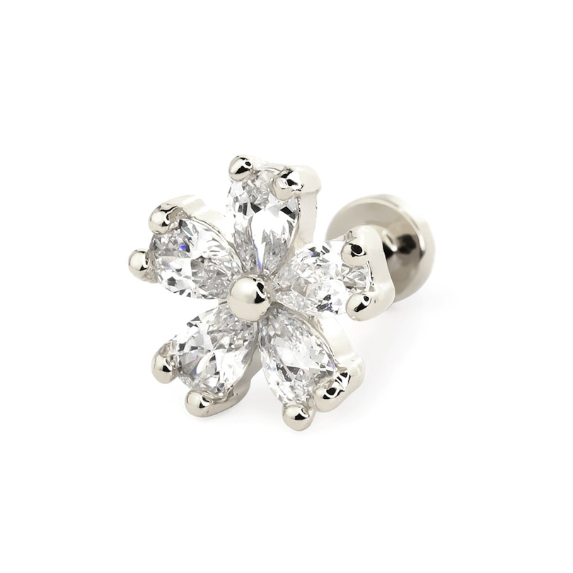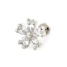 Ce labret dispose d'un sublime élément décoratif en forme de fleur. Les pétales sont composés d'un ensemble de pierres. La fleur prend véritablement forme grâce aux cinq pierres transparentes taillées en forme de goutte qui brillent de mille feux.