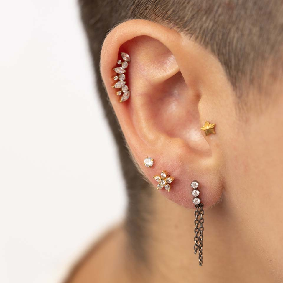 Placement: Tragus, Spiderbite, Snakebite, Medusa, Madonna, Lower labret, Lobe, Hélix, Conch, Anti-hélix, Angelbite