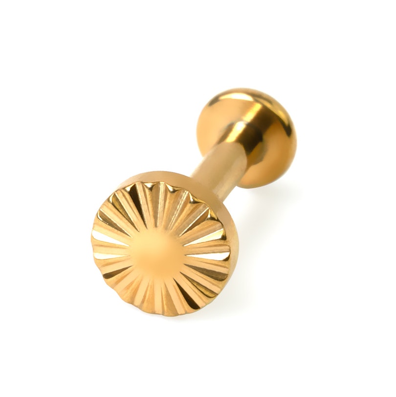 Le bijou que nous te présentons est un joli labret en titane doté d'une partie supérieure circulaire gravée de lignes rayonnant de son centre, à la manière d'un diamant. Il possède un filetage interne et un disque plat à son extrémité inférieure : il est donc très facile à insérer dans ton trou de piercing et très agréable à porter. De plus, ce labret est fabriqué en titane de qualité implantaire, un matériau hypoallergénique qui convient parfaitement aux personnes aux peaux sensibles. Tu peux choisir parmi deux modèles, un avec des finitions en or et un avec des finitions en argent, ainsi que parmi plusieurs longueurs différentes. Grâce à son épaisseur du fil de 1,2 mm, ce bijou sera du plus bel effet dans des piercings à l'oreille et aux lèvres.