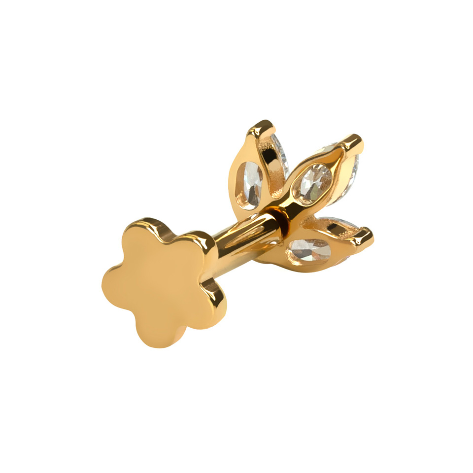 Le bijou que nous te présentons est un sublime labret avec deux extrémités différentes : un design en forme de feuille avec trois pierres taille marquise sur la partie supérieure et un fermoir plat en forme de fleur sur la partie inférieure. Il s'agit donc d'un bijou idéal pour les piercings où l'on voit la partie arrière de ton bijou.