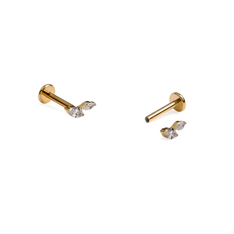 Ce labret orné de deux pierres taille marquise est la preuve que quelquefois, moins c'est plus. Grâce à leur forme allongée, qui rappelle des ailes ou des feuilles, ce bijou est idéal pour ajoute une touche d'élégance à ta compo d'oreille, sans pour autant voler la vedette à tes autres bijoux.