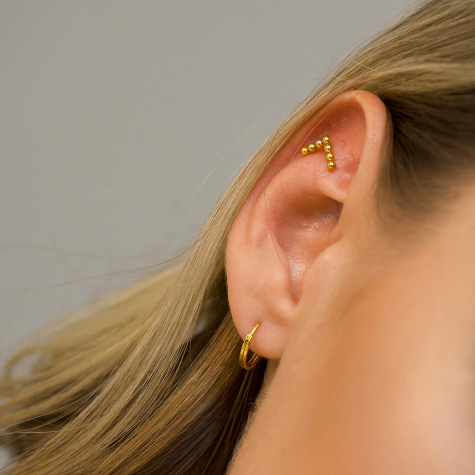 La partie supérieure de ce labret en titane est un chevron formé par plusieurs perles. Le chevron est un design à la mode dans le monde du piercing. Celui-ci est composé de 7 perles et chacune d'entre elles mesure 2 mm. Chaque partie du chevron mesure 7,8 mm. Ce bijou est disponible en deux couleurs différentes, à savoir : or et argent.