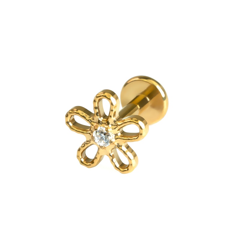 Le bijou que nous te présentons est un labret avec un design en forme de marguerite orné d'une pierre en zircon, pour toujours plus d'éclat et de brillance. De plus, il est doté d'un filetage interne. Dans la pratique, cela signifie qu'il est très facile à mettre en place. Il te suffit de retirer la partie supérieure, d'insérer la tige dans ton trou de piercing et de remettre délicatement la partie supérieure. Un vrai jeu d'enfant ! Ce labret est en titane, un matériau hypoallergénique et extrêmement durable. Il est disponible avec des finitions en or ou en argent et en plusieurs longueurs, idéal pour choisir le modèle qui te convient le mieux. Qu'attends-tu pour ajouter une touche d'élégance à ton look avec ce fabuleux design en forme de marguerite ?