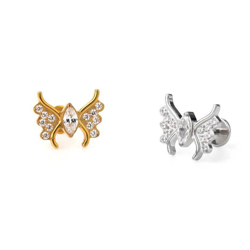 Le bijou que nous te présentons est un labret doté d'un superbe design en forme de papillon. Le corps du papillon est représenté par une sublime pierre sertie de forme ovale en zircon, tandis que ses ailes sont ornées de six petites pierres scintillantes. Comme tu peux le voir, le niveau de détail de ce labret est saisissant ! De plus, ce bijou est en titane, un matériau durable et hypoallergénique. Autre avantage : il possède un filetage interne. Dans la pratique, cela signifie qu'il est très facile à insérer et à enlever de ton trou de piercing, tout en étant très agréable à porter. C'est donc le bijou idéal pour ajouter une touche d'élégance et de classe à ton arrangement d'oreilles.
