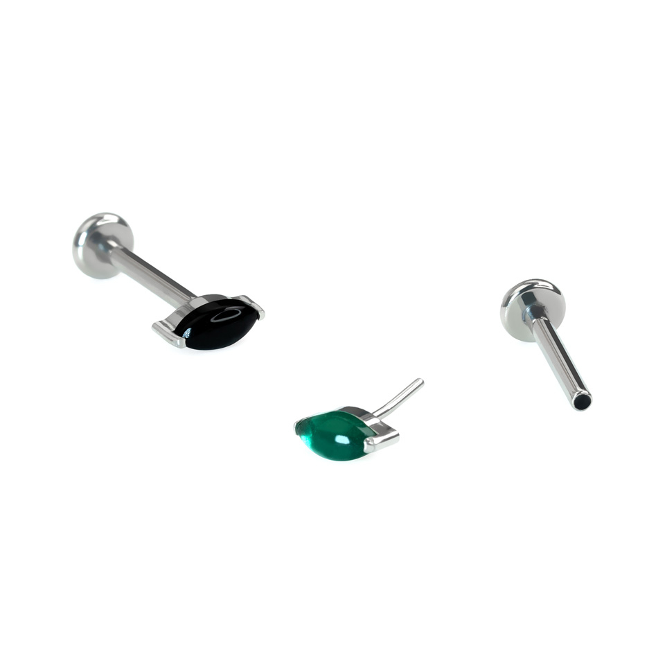Le bijou que nous te présentons est un labret avec une sublime pierre d'onyx naturelle taillée en marquise, disponible en deux couleurs : un noir profond et un vert pétillant. Comme tu peux le voir, la pierre est fixée sur le bijou à l'aide de la méthode dite du serti à griffes.