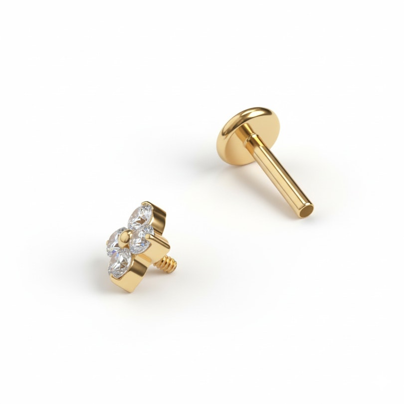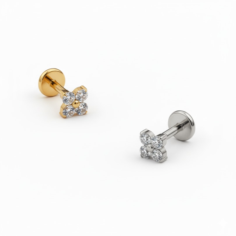 Tu aimes les fleurs ? Tu aimes les bijoux de piercing ? Alors, ce bijou devrait te plaire. Ce labret possède un design miniature en forme de fleur et orné de petites pierres avec un sertissage à griffes. Une fois en place, les pierres viennent se placer tout près de ta peau, ce qui crée un effet saisissant. Deux modèles (un doré et un argenté) et deux tailles sont disponibles. Et si tu veux aller encore plus loin et ajouter de la texture à ton look, porte-les ensemble, effet garanti !