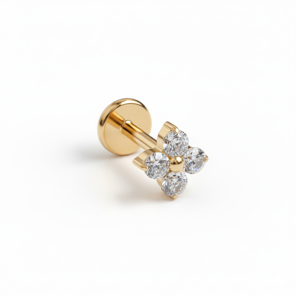 Tu aimes les fleurs ? Tu aimes les bijoux de piercing ? Alors, ce bijou devrait te plaire. Ce labret possède un design miniature en forme de fleur et orné de petites pierres avec un sertissage à griffes. Une fois en place, les pierres viennent se placer tout près de ta peau, ce qui crée un effet saisissant. Deux modèles (un doré et un argenté) et deux tailles sont disponibles. Et si tu veux aller encore plus loin et ajouter de la texture à ton look, porte-les ensemble, effet garanti !