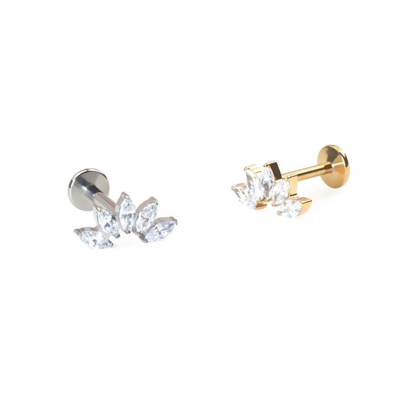 Le bijou que nous te présentons est un labret avec cinq pierres en oxyde de zirconium taillées en marquise et superbement mises en valeur grâce à un design incurvé. Ce bijou possède un filetage interne : pour le mettre en place, il te suffit d'insérer la tige dans ton trou de piercing, d'y visser délicatement la partie supérieure et le tour est joué ! De plus, il est fabriqué en titane, un matériau agréable à porter, même pour les personnes à la peau sensible en raison de ses propriétés hypoallergéniques. Il sera donc du plus bel effet dans de nombreux piercings d'oreilles, notamment à l'hélix ou au piercing flat.