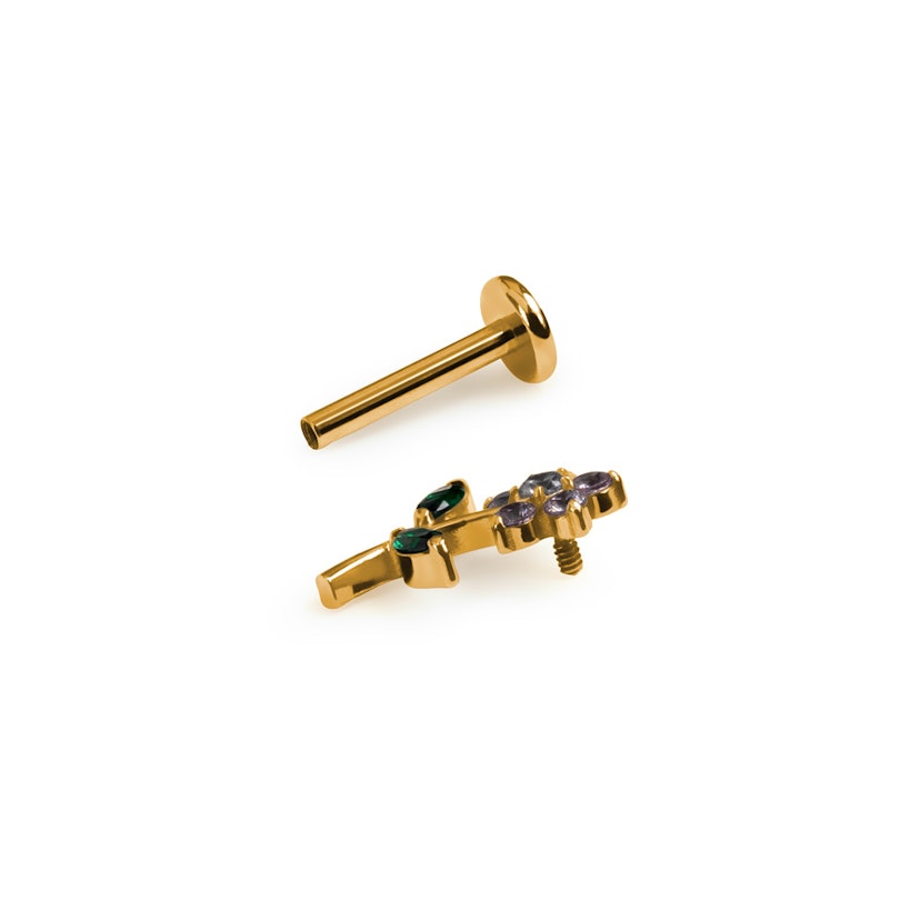 Son filetage interne assure un solide maintien et supprime le risque d'irritation lors de l'insertion. Deux modèles sont disponibles : un avec des finitions en argent et un avec des finitions en or. Les deux seront du plus bel effet dans de nombreux piercings, notamment au conch, à l'hélix ou encore au lobe. N'oublie pas : avec les fleurs, tu ne peux jamais te tromper !