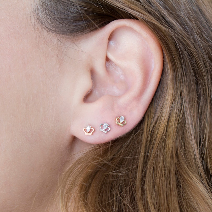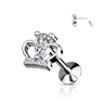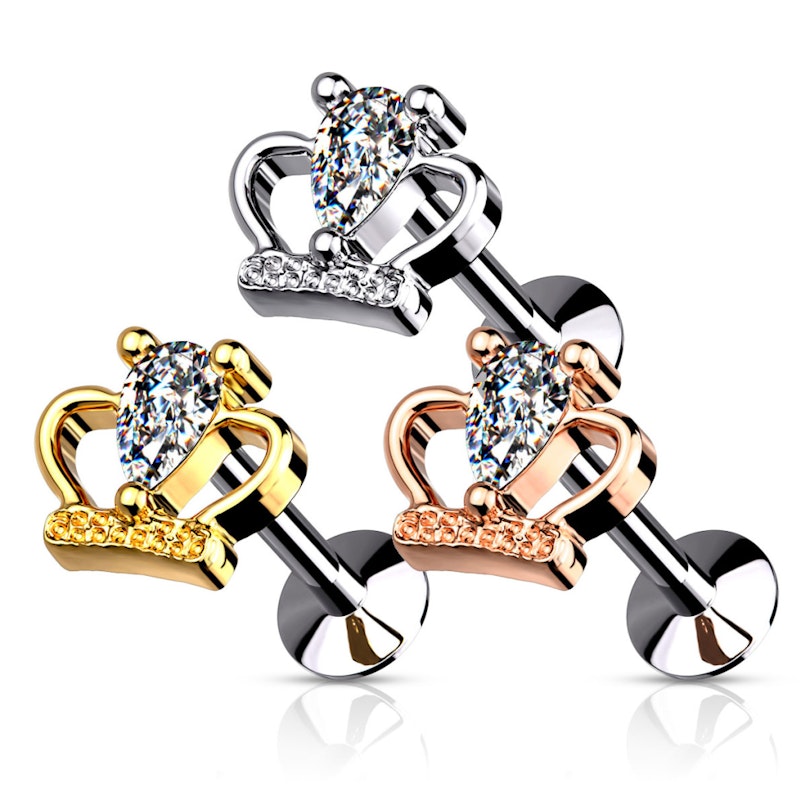 Ce labret est muni d'une sublime couronne sur la partie avant. Cette dernière est disponible en plusieurs couleurs différentes. Tous les modèles disponibles ont la même longueur, la même épaisseur du fil ainsi que la même couleur de pierre. La couronne est ornée, en son centre, d'une magnifique pierre transparente en forme de larme inversée. À l'arrière de la couronne se trouve une petite goupille qui est insérée dans la tige. Si tu remarques que la couronne n'est pas suffisamment serrée, tu peux légèrement plier la goupille pour ajuster la tension et ainsi assurer un meilleur maintien.