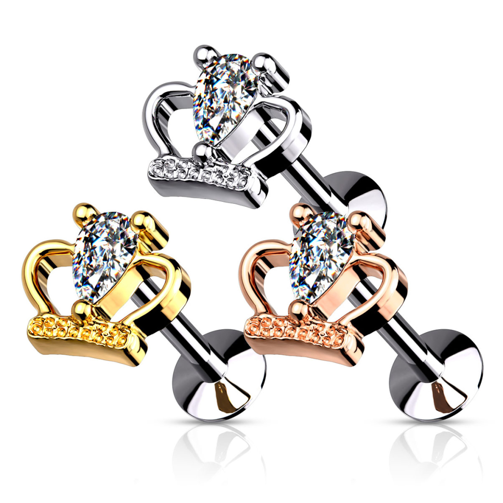 Ce labret est muni d'une sublime couronne sur la partie avant. Cette dernière est disponible en plusieurs couleurs différentes. Tous les modèles disponibles ont la même longueur, la même épaisseur du fil ainsi que la même couleur de pierre. La couronne est ornée, en son centre, d'une magnifique pierre transparente en forme de larme inversée. À l'arrière de la couronne se trouve une petite goupille qui est insérée dans la tige. Si tu remarques que la couronne n'est pas suffisamment serrée, tu peux légèrement plier la goupille pour ajuster la tension et ainsi assurer un meilleur maintien.