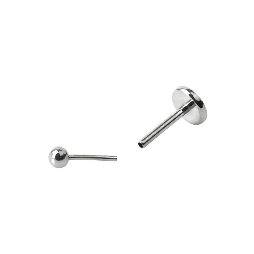 Combien de fois as-tu lutté avec un bijou de piercing fileté ? Les raisons sont nombreuses : certains trous de piercing sont difficiles à atteindre ou tu ne disposes pas de suffisamment d'espace pour visser la boule. Ce labret possède un mécanisme d'insertion de type « push-in ». Dans la pratique, cela signifie que la boule supérieure est munie d'une petite épingle qui doit simplement être insérée dans la tige du labret. Comme ce bijou ne possède pas de filetage, son insertion est un véritable jeu d'enfant, et ce même dans les endroits délicats tels que le trou de piercing à la conque.