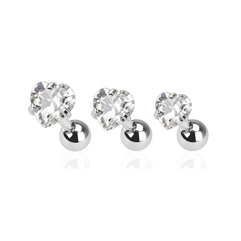 Tu peux porter cet ensemble avec trois bijoux différents dans presque tous les piercings de tes oreilles, à condition qu’ils soient faits avec des aiguilles. Cet ensemble contient trois bijoux identiques mais de tailles différentes. Tous ont un bel éclat, en forme de cœur et dont les diamètres correspondent à 3, 4 et 5 mm. En vérité c'est une taille approximative, car il est difficile de dire le diamètre d'un bijou qui n'est pas entièrement rond.