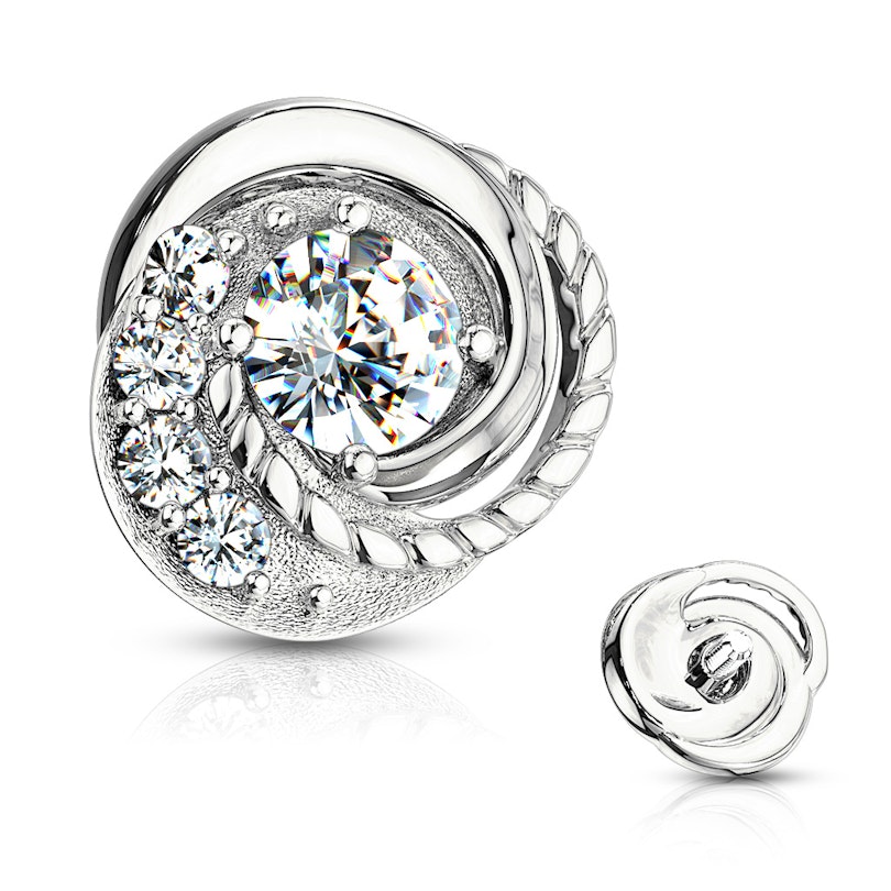 Ce piercing microdermal est l’un des plus original. Il a un joli motif tressé qui part de l'extérieur et se dirige vers le milieu. De plus, il a une surface rugueuse sur laquelle reposent des pierres, qui partent également de l'extérieur et se dirigent vers le milieu. Enfin, il y a aussi une grosse pierre centrale brillante au centre qui complète le look.