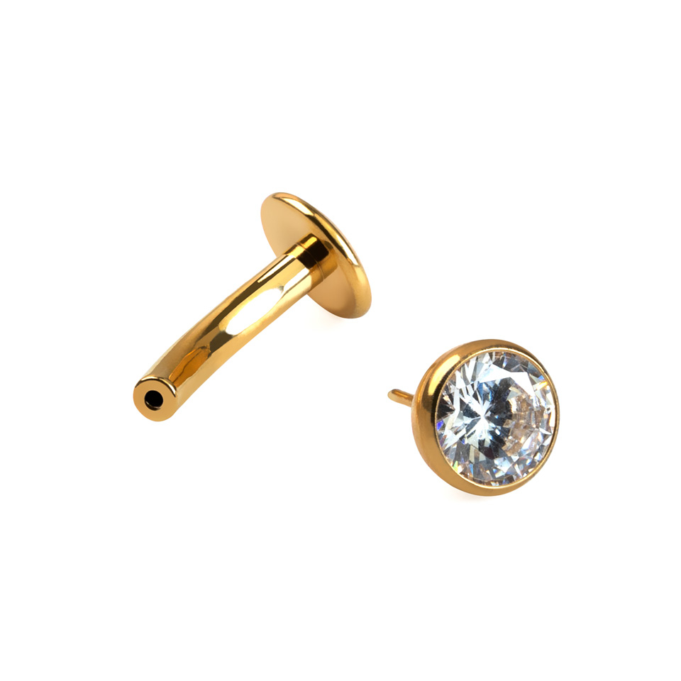 La partie supérieure, c.-à-d. celle avec la pierre sertie, et le disque plat ont un diamètre de 5 mm. Enfin, ce bijou est disponible avec deux finitions différentes, or et argent.