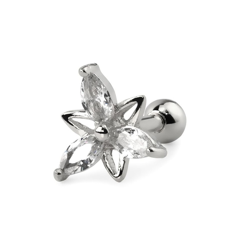 Cette boule sert de mécanisme de verrouillage et mesure 3 mm. La tige mesure 6 mm, pour une épaisseur du fil de 1,2 mm. La tige est en acier chirurgical tandis que le motif en forme de pétales de fleur est en laiton. Ces deux matériaux ont été revêtus soit de rhodium soit d'or 14 carats, en fonction du modèle que tu choisis.