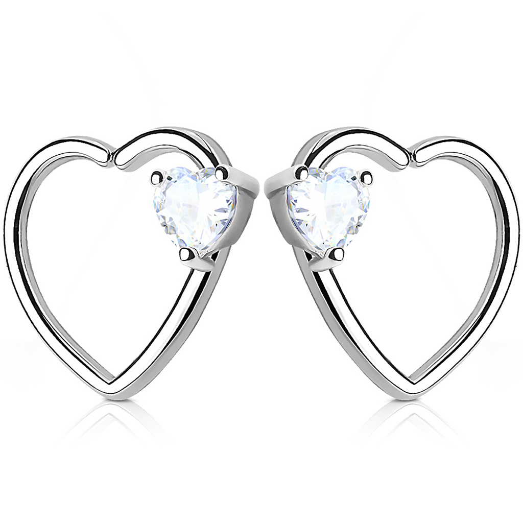Ce piercing a la forme d'un cœur avec une petite pierre en forme de coeur sur l'un des côtés. Les dimensions intérieures de ce cœur sont de 11 mm de largeur sur 9 mm de hauteur. La petite pierre mesure env. 4x4 mm. et est situé sur le côté droit du cœur, comme sur l'image du produit. Le cœur n'est visible que par l'avant.