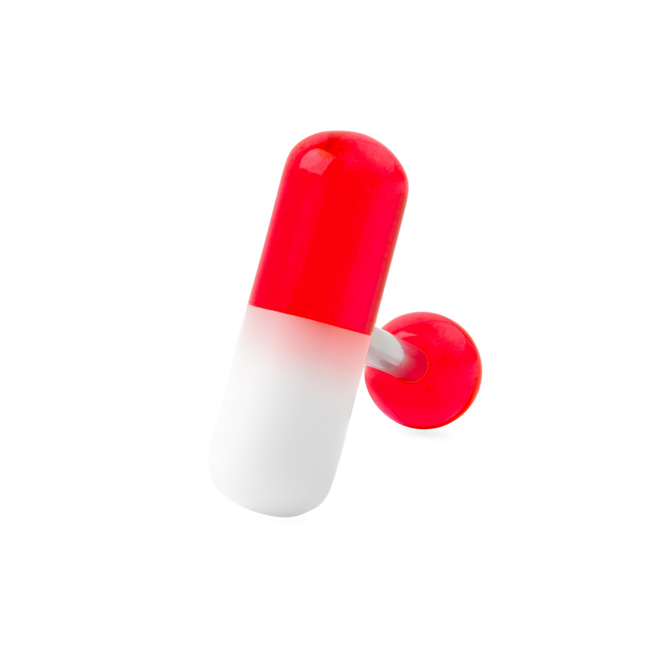 Ce bijou est en acier chirurgical, mais au lieu d'une boule supérieure, il possède une pilule bicolore en acrylique, un matériau sûr qui protège tes gencives et tes dents. L'acrylique est une matière plastique qui, en plus d'être sans nickel, est la meilleure option pour ton piercing à la langue.