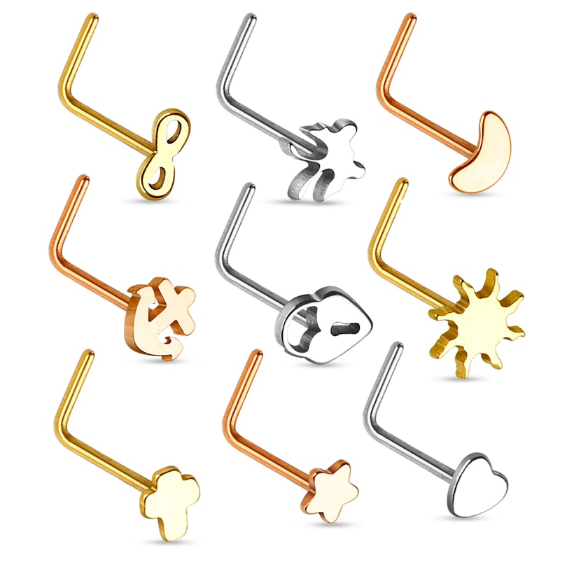 Ce piercing pour le nez a différents motifs : le symbole de l'infini, une ancre ou une belle croix. Choisis celui que tu préfères et la couleur dans laquelle tu le veux. Les couleurs disponibles sont : argent, or et or rouge.