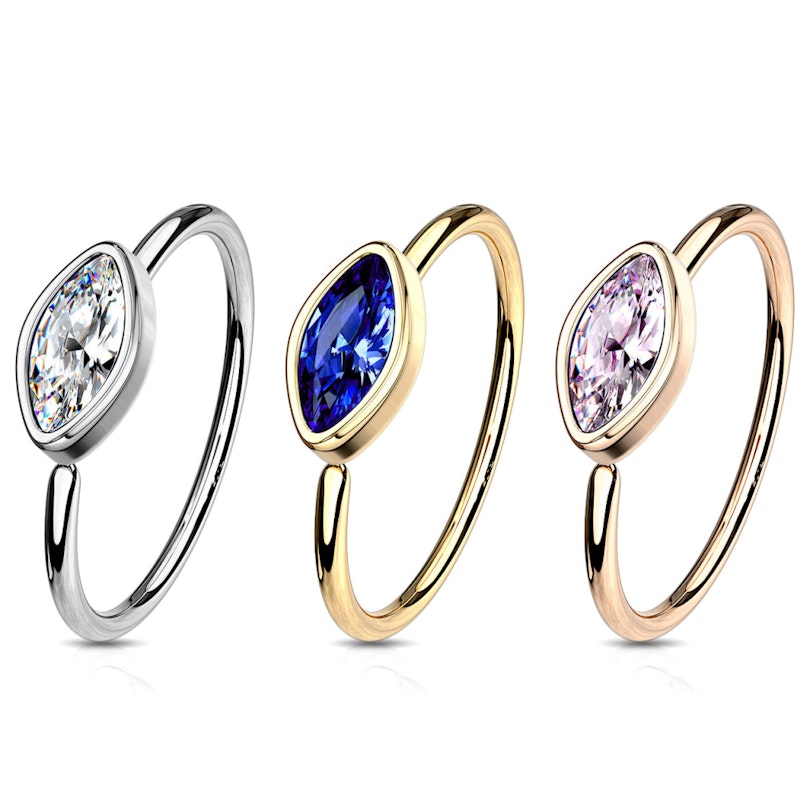 L'anneau est en acier chirurgical et mesure 0,8 mm en épaisseur de fil et 8 mm de diamètre, le rendant parfaitement adapté pour un piercing au nez. L'anneau est fait pour tourner en arrière quand il est mis dans un piercing. Cela facilite également le maintien. Sur le devant, il y a un joli motif ovale avec une pierre ovale étincelante. Ce motif est en laiton et revêtu de manière à correspondre au reste de l'anneau.