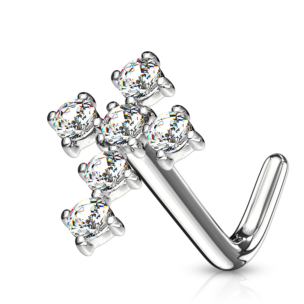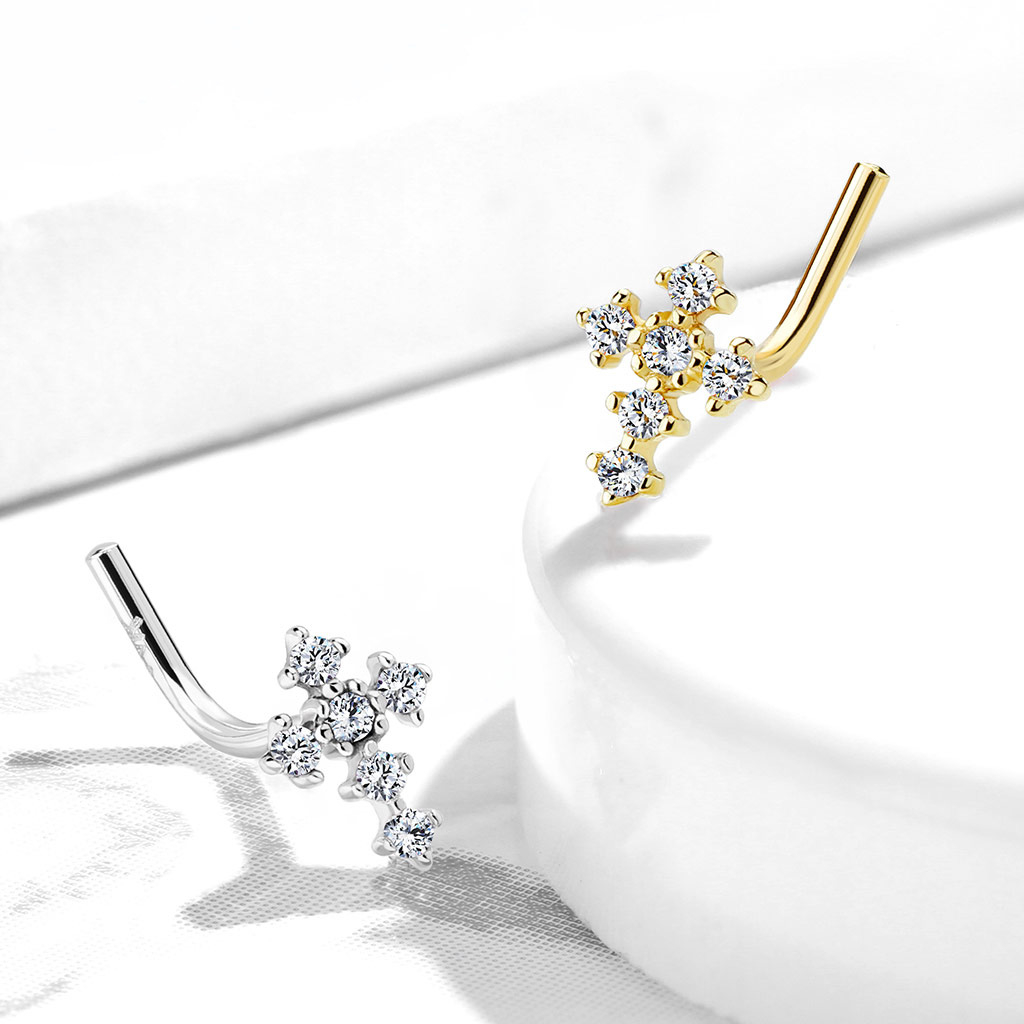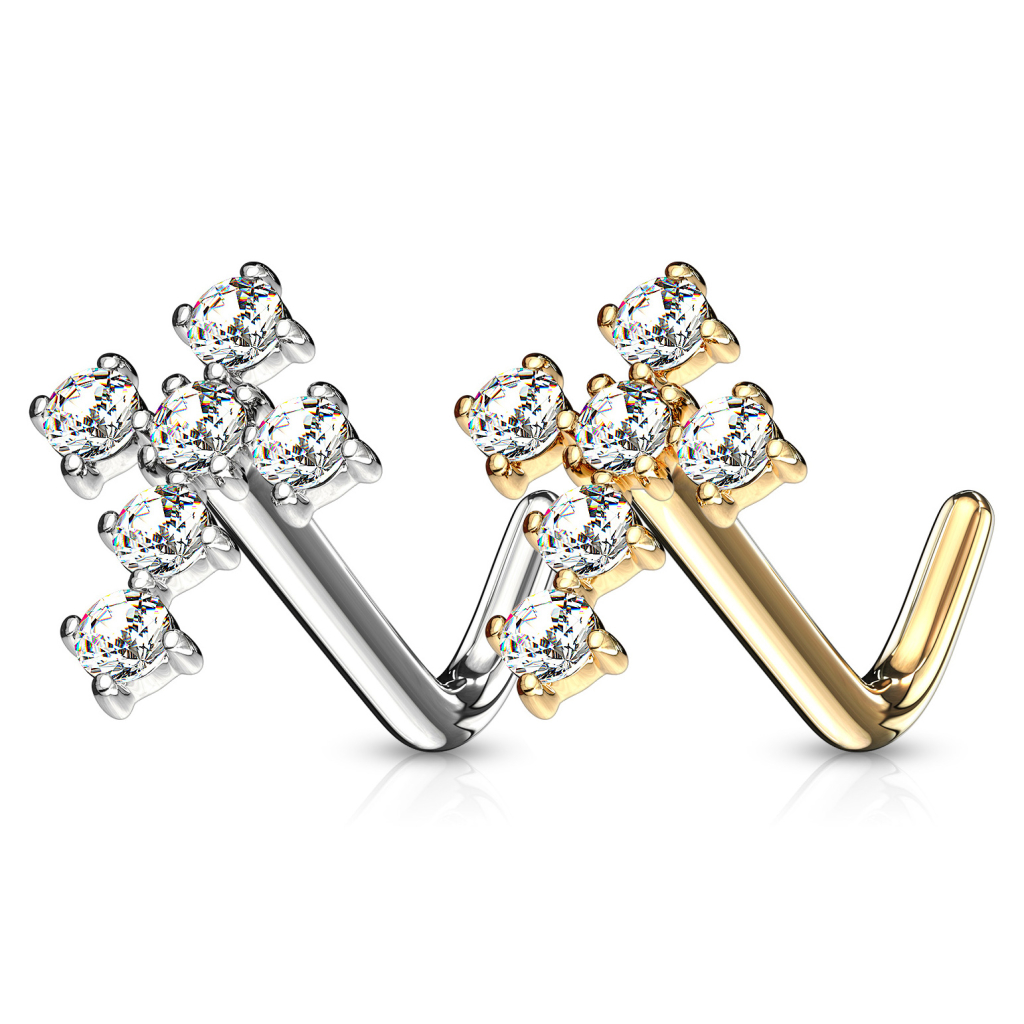 Ce piercing pour le nez est spectaculaire ! Étonnant de haut en bas, de la belle couleur de la croix à la barre en forme de L. Ce piercing pour le nez est non seulement esthétique mais il est aussi fabriqué en or 14K, un excellent matériau pour tes piercings. Tu peux l'obtenir soit en or jaune classique, soit en or blanc. La tige est faite avec un petit crochet, un angle plié à 90 degrés, qui offre un double avantage : la structure permet au piercing de ne pas se détacher et facilite également sa mise en place.