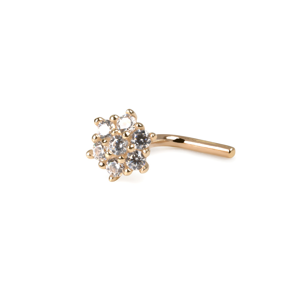 Ce piercing pour le nez est en or 14 carats. Sur la partie supérieure se trouve une splendide fleur brillante composée de petites pierres transparentes. Nous devrions plutôt dire que les pierres reposent sur une structure en forme de fleur. Cette vis en forme de L et présente un angle à 90 degrés, ce qui permet au bijou d'être fermement maintenu dans ton nez, sans risque de tomber.