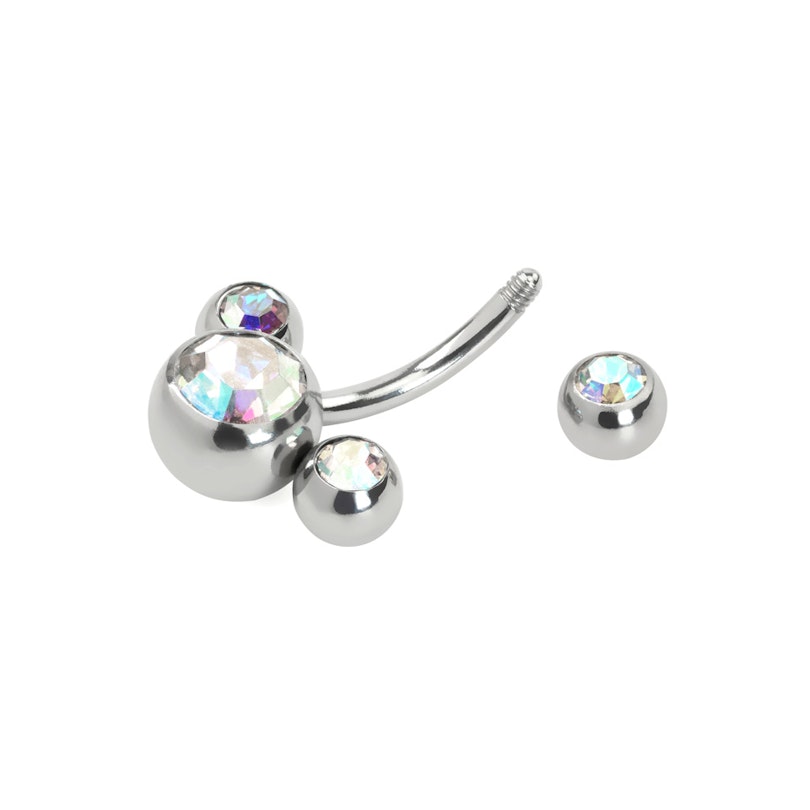 Ce bijou en particulier a une forme que tout le monde connait, avec une tige courbée de 10 mm, une boule supérieure et une boule inférieure. La différence est que ce bijou a deux boules reliées à la boule du bas. Chacune de ces boules a une pierre, à partir duquel tu peux choisir la couleur.