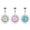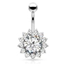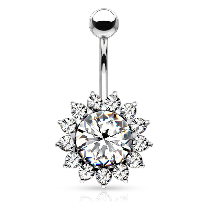 Ce piercing pour le nombril a un bel éclat au centre, très grand comparé à d’autres bijoux similaires. Lorsque la lumière frappe directement, elle rend le bijou particulièrement beau. Autour de celui-ci, il y en a d'autres plus petits et brillants, qui représentent les feuilles autour du tournesol.