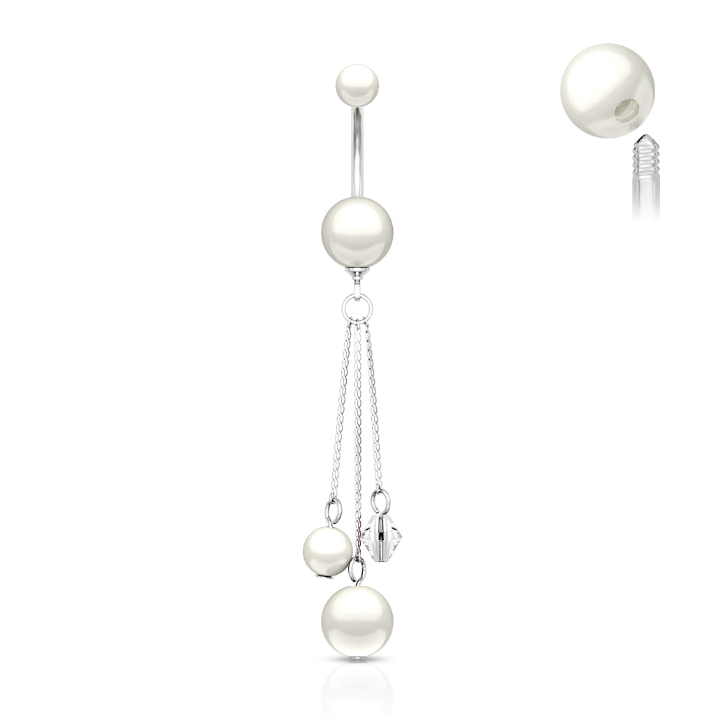 Le joli bijou que nous te présentons est un piercing pour le nombril en acier chirurgical avec des perles en acrylique et trois chaînes pendantes qui forment un sublime design asymétrique. Une boule est située à l'extrémité de chaque chaîne et l'une d'entre elles a la forme d'un diamant. De plus, toutes les boules et perles sont de la même couleur.