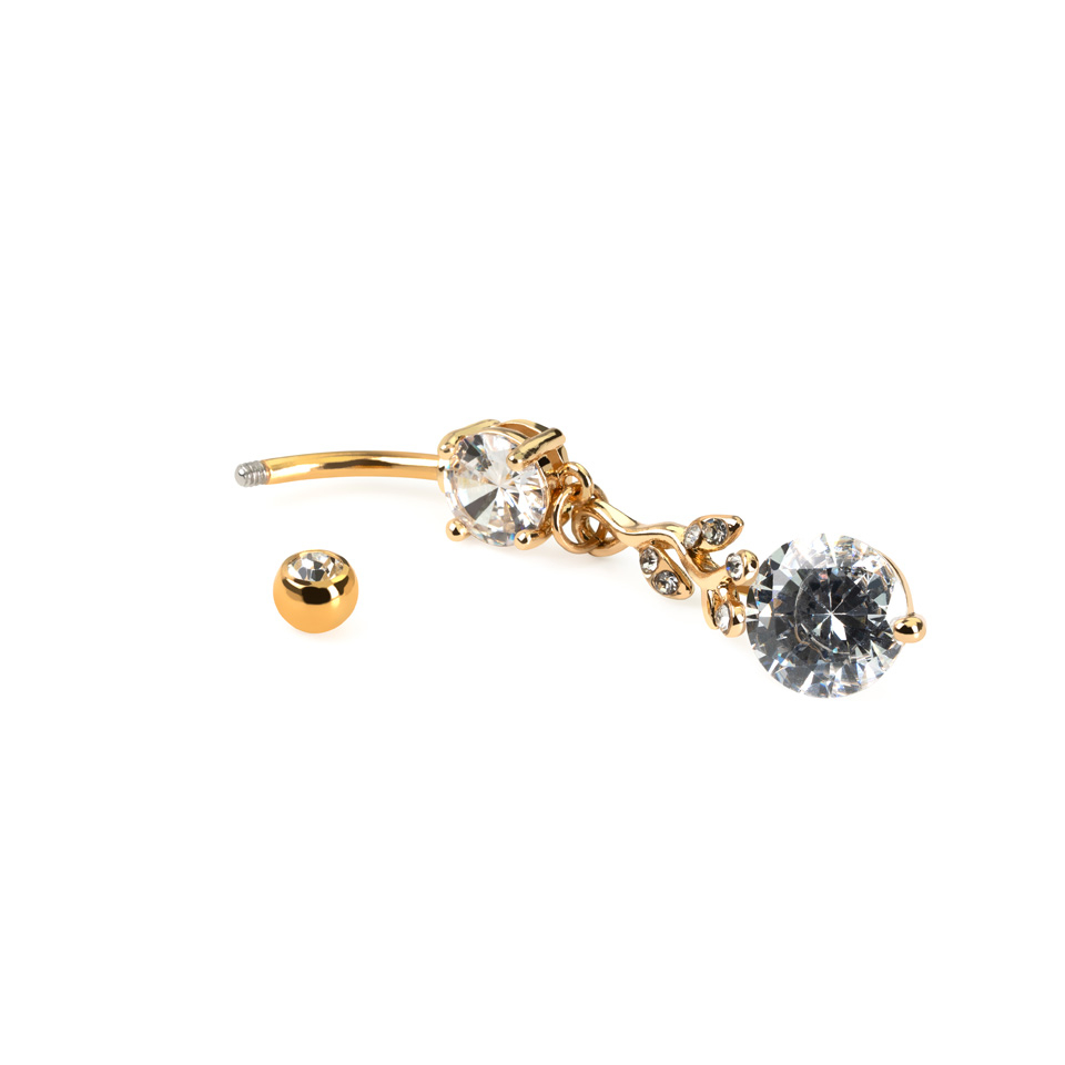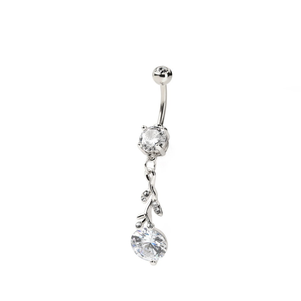Ce piercing au nombril a un pendentif en forme de branche et de feuilles incrustées de pierres. Celles-ci rendent ce piercing magnifique et vivant. Dans le bas du pendentif, il y a une grande pierre en zircon, d'autres nombreuses pierres sont également présentes dans ce bijou. Les pierres dans la base et le bas du pendentif sont bloquées grâce à des petits bras qui les retiennent. Cela garantit qu'elles ne tomberont pas.