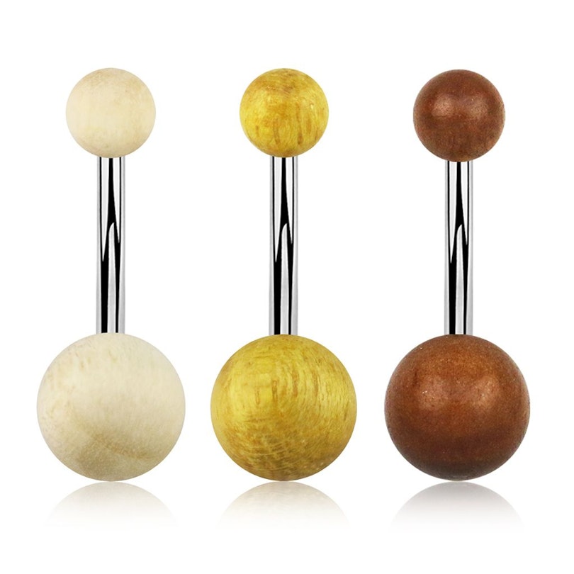 Tu vois rarement des bijoux en bois. Lorsque tu les vois, c'est presque uniquement pour une utilisation dans l'oreille. Cependant, ce bijou n'est pas à 100% en bois car la tige est en acier chirurgical. Mais la tige est cachée dans le nombril, donc on ne verra que les boules. Tu peux choisir parmi trois types de bois, où la couleur et l'arbre sont les seules différences. Les variétés d'arbres sont les crocodiles qui sont les plus légers, le saba qui est le brun rougeâtre et le jacquier qui est le jaune. Tous les modèles ont en commun le sommet avec une balle en haut de de 5 mm. et en bas une balle de 8 mm. Les deux boules ont été équipées d'un anneau pour pouvoir être dévissées.