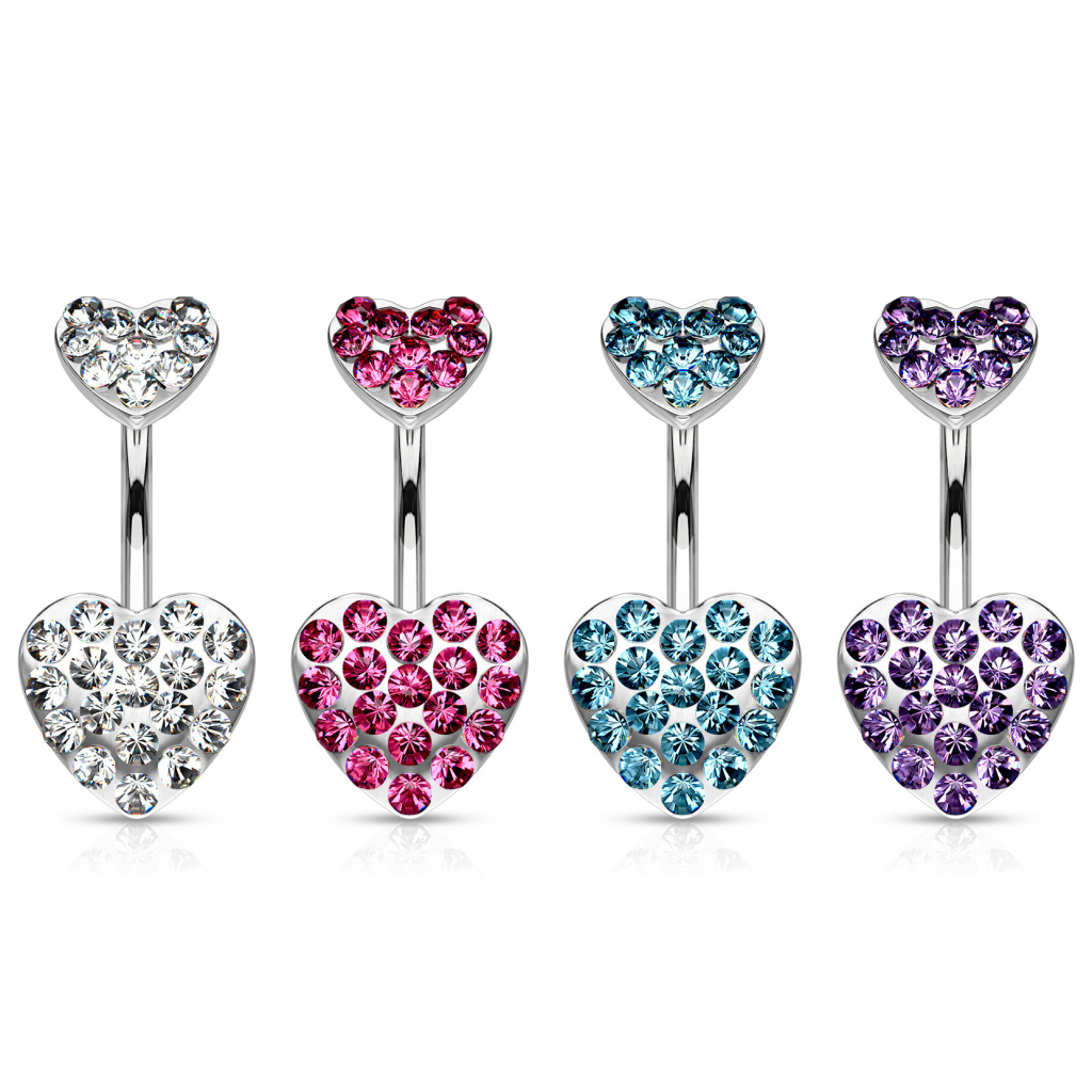 Il est fabriqué en acier chirurgical et a une tige de 10 mm de long. Au lieu des boules supérieures et inférieures classiques, il a deux beaux cœurs remplis de nombreux incrustés de couleurs vives. Ces petites pierres brillantes ont une taille qui rappelle celle des brillantes, et qui permettent à la lumière de s'y refléter sous différents angles. Il existe en cinq couleurs fantastiques, toutes spectaculaires.