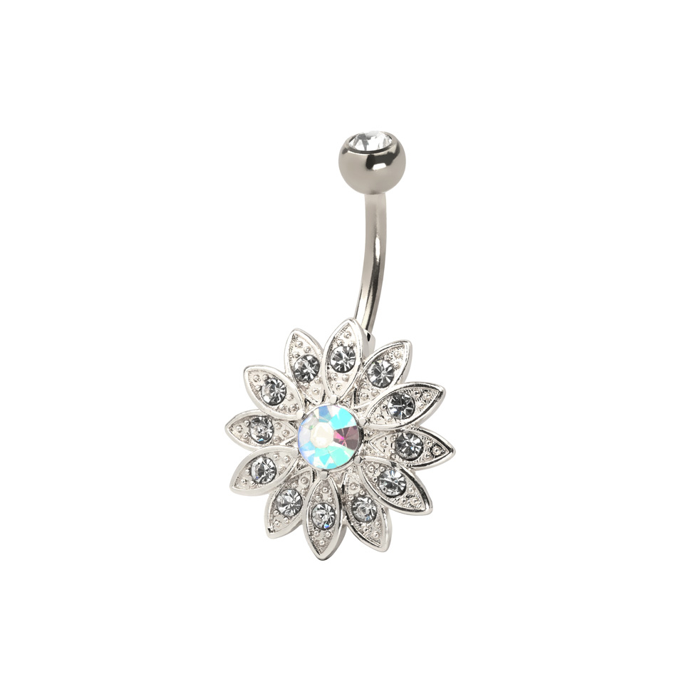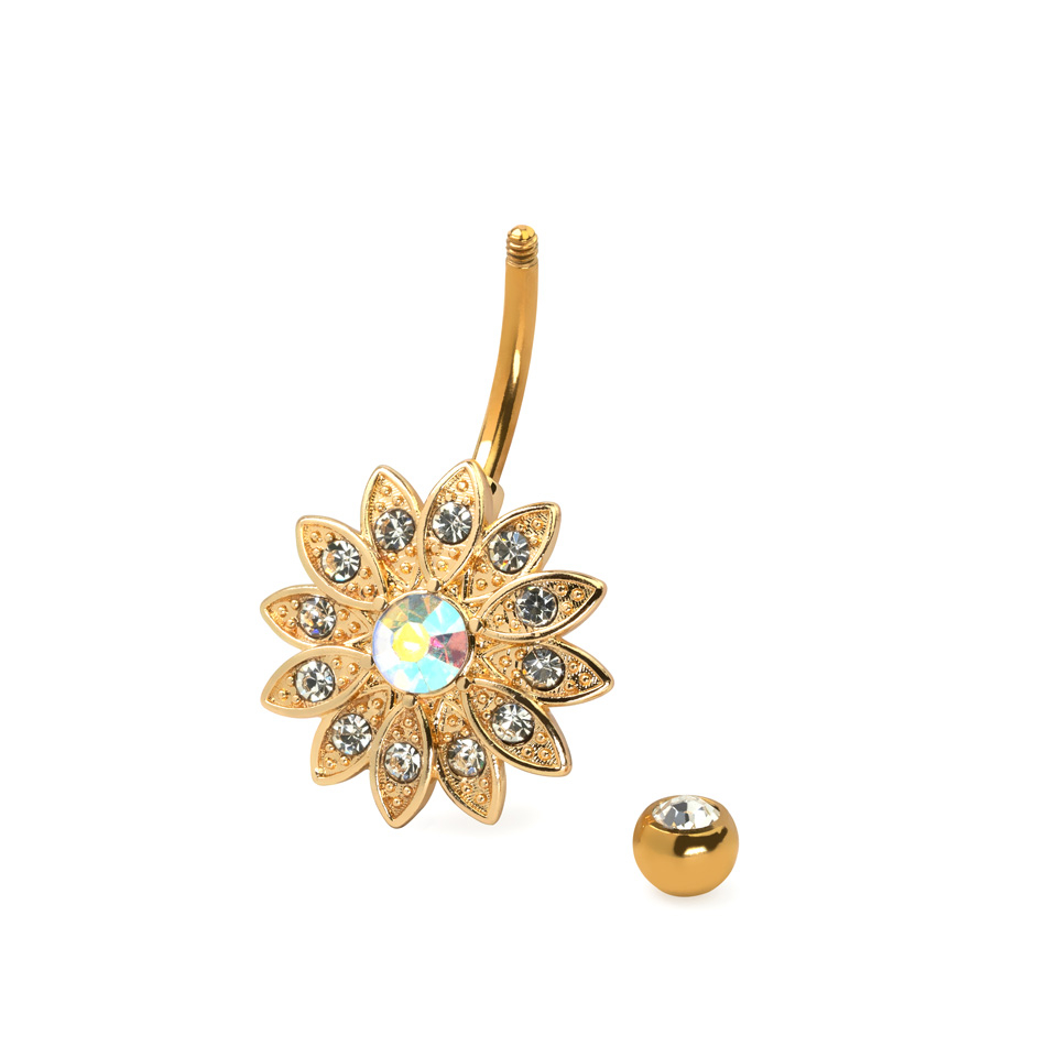 La fleur a un total de 12 pétales qui sont en fait 12 pierres brillantes, très très brillants. Ce piercing sera absolument splendide dans ton nombril, car grâce au mouvement, ce bijou est encore plus radieux, car la lumière se reflète dans toutes les directions. Les pétales sont placés en deux couches, de sorte que la profondeur est également créée dans le bijou. C'est un bijou magnifique.
