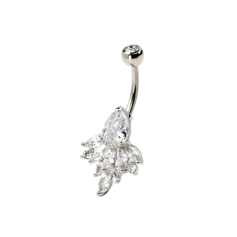 Ce bijou pour le nombril est tout simplement magnifique. Pour commencer, il a une tige courbée de 10 mm de long et une boule supérieure avec une pierre. Si tu regardes de plus près, tu verras qu'il en existe plusieurs qui sont maintenus dans une goutte brillante plus large - tous taillés comme s'il s'agissait de diamants, afin que la lumière puisse les réfléchir sous de nombreux angles différents. Les diamants inférieurs sont répartis en trois rangées différentes, qui se terminent par un oblong brillant au bas.