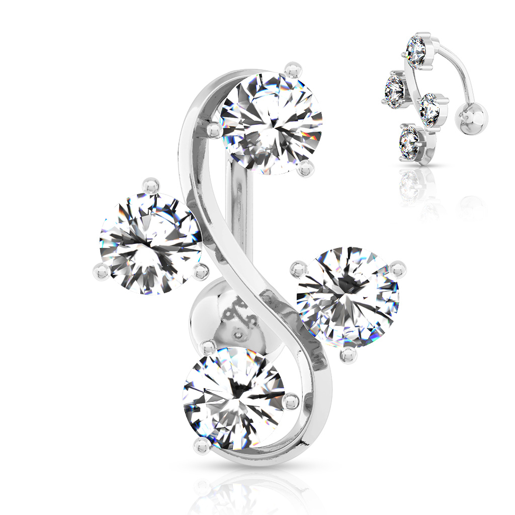 Bijou original et attachant pour le piercing au nombril avec quatre diamants autour de la forme d'un "S". Ce sera spectaculaire dès que la lumière tombera sur les brillants, car son design permet de voir un peu de la peau qui se cache derrière le bijou. Il est fabriqué en acier chirurgical, le matériau le plus utilisé dans le monde du piercing car il ne dégage pas de particules de nickel et il est incroyablement résistant.