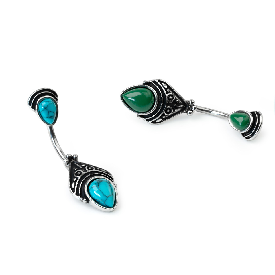 Il y a une pierre en forme de goutte, dont tu peux choisir la couleur. Par exemple, la couleur turquoise, où les pierres ici ont un motif noir, donne un peu plus de jeu à la pierre. Le vert est un peu plus mat et habille très bien le bijou.