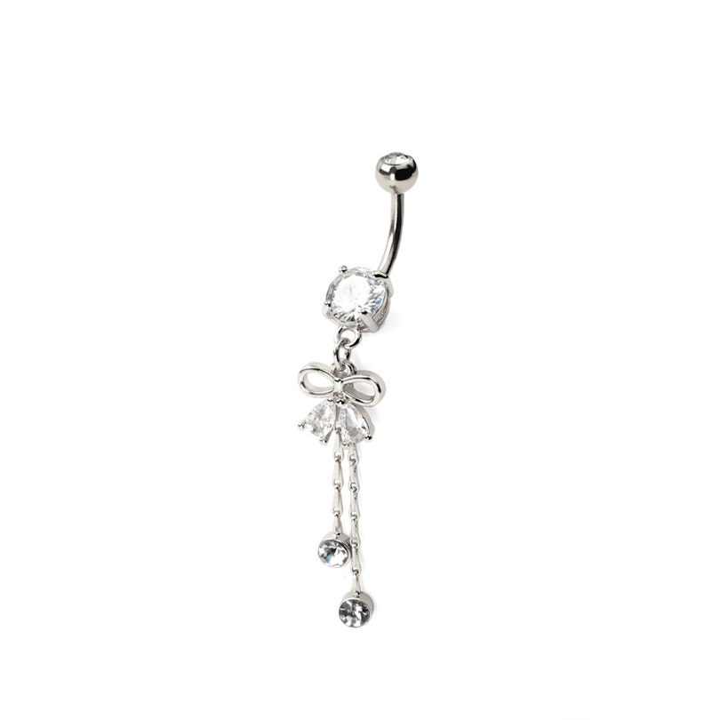 Ce piercing au nombril est l’un des plus longs. Il mesure un peu moins de 6 cm. de haut en bas. La longueur totale de la tige est de 10 mm. Il est décoré de pierres, de chaînes et d'un joli petit noeud. La boucle est composée de laiton et de deux pierres en forme de goutte qui reposent juste en dessous de la pierre au bas de la tige. Au-dessous de la boucle se trouvent deux chaînes en suspension libre, dans lesquelles se trouve une pierre claire au bas de chaque chaîne. L'une des chaînes est plus longue que l'autre.