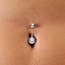 Ce bijou a la forme classique d’une tige courbée pour le nombril, avec une pierre dans sa boule inférieure et une autre dans sa boule supérieure. Cependant, sa conception a la particularité que la pierre supérieur est au sommet de la boule, et le plus petite au centre.