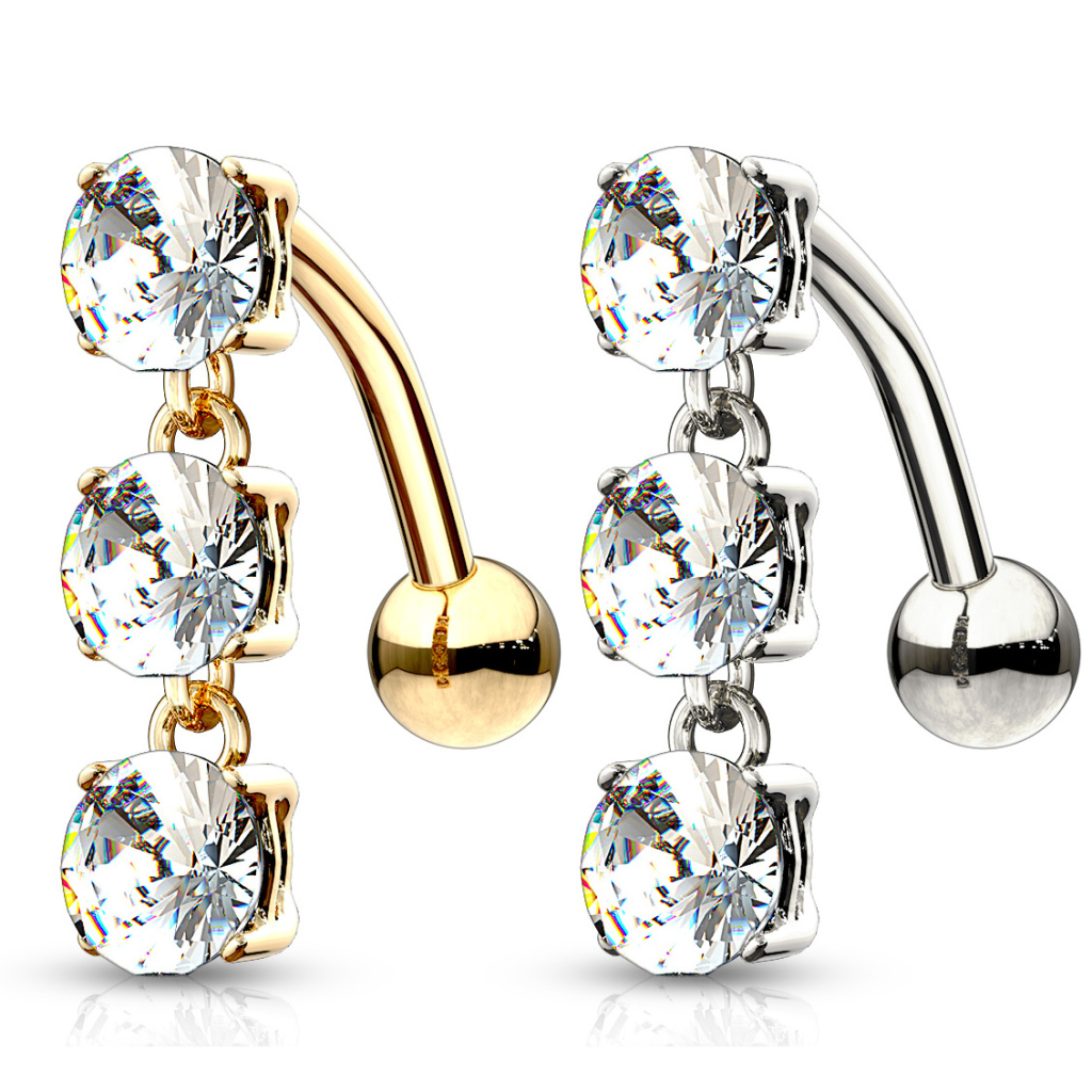 Nom: Piercing pour le nombril en or 14 carats avec un pendentif inversé et trois pierres