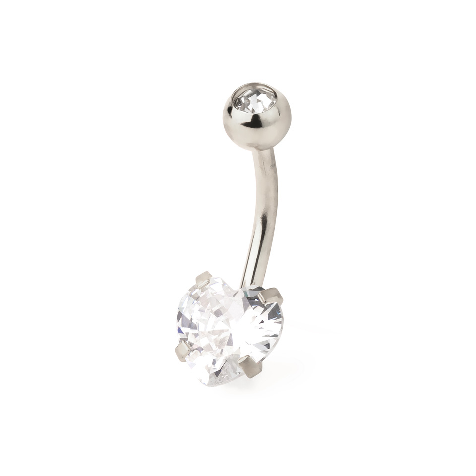 Les cœurs sont des formes populaires pour les piercings, car c'est une forme très polyvalente qui fonctionne bien pour les bijoux en général. Cette fois, le cœur prend sa forme à travers une pierre sculptée, que tu peux trouver dans la photo plus haut sur cette page. La pierre précieuse en forme de cœur en bas n'est pas la seule pierre que comporte cette pièce. Il y a aussi une pierre claire sertie d'un biseau sur le dessus, qui s'accorde parfaitement avec la pierre du bas.