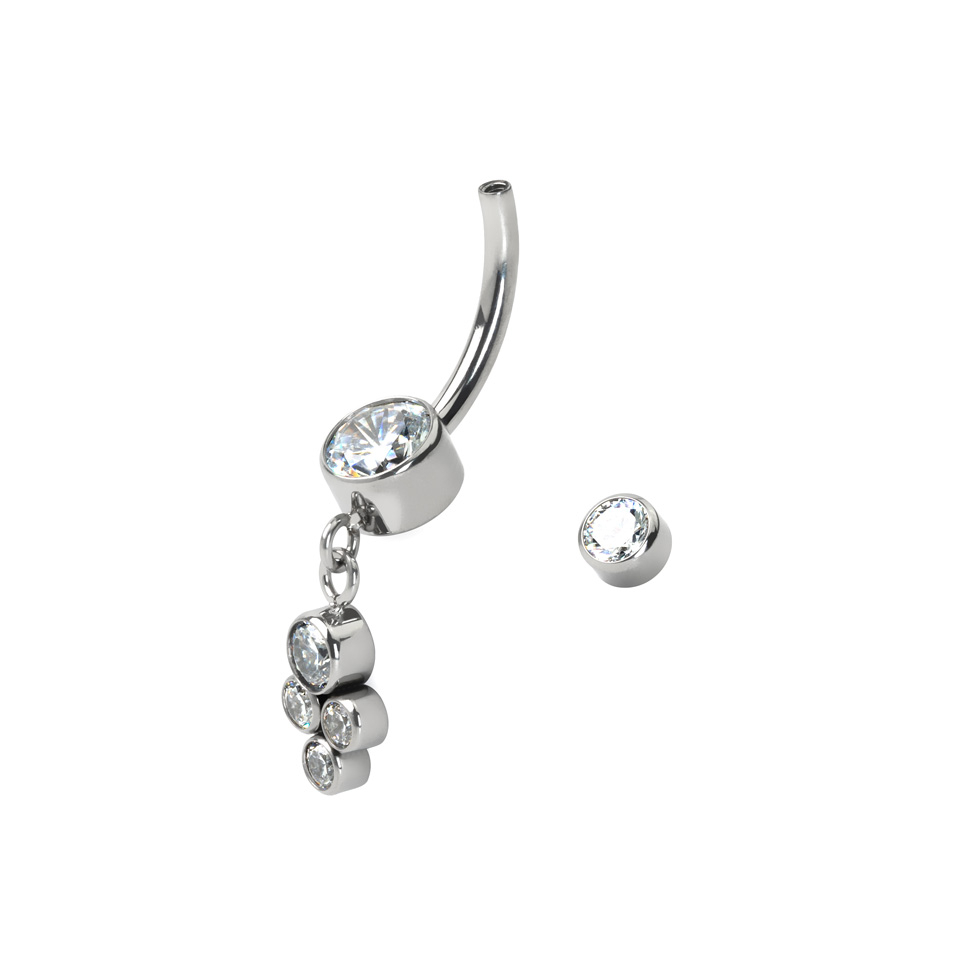 Si tu recherches un piercing pour le nombril extravagant, ce bijou est exactement ce qu'il te faut ! Il se compose d'un ensemble de 4 pierres serties au niveau de la partie inférieure. Cet ensemble de pierres prend la forme d'un pendentif suspendu à une plus grosse pierre scintillante. Sur la partie supérieure de la tige à filetage interne, on trouve une autre pierre.