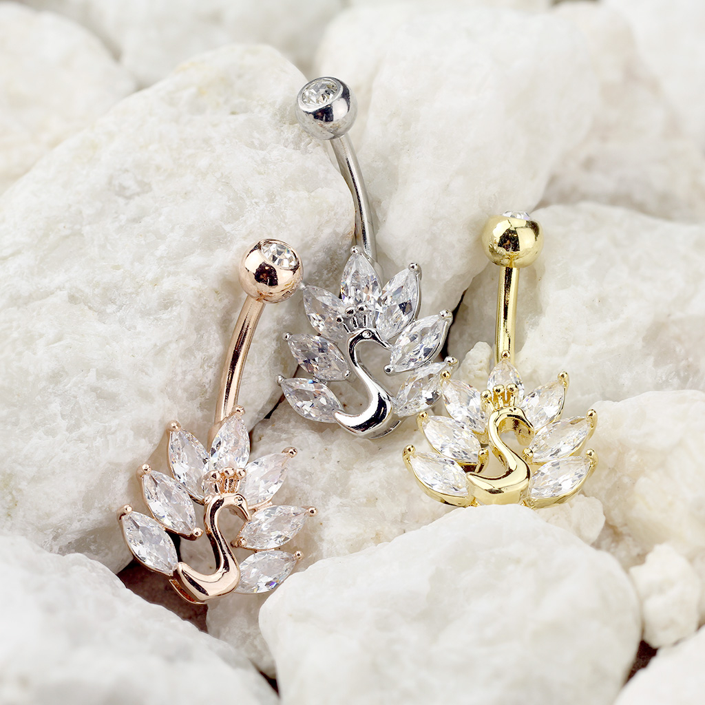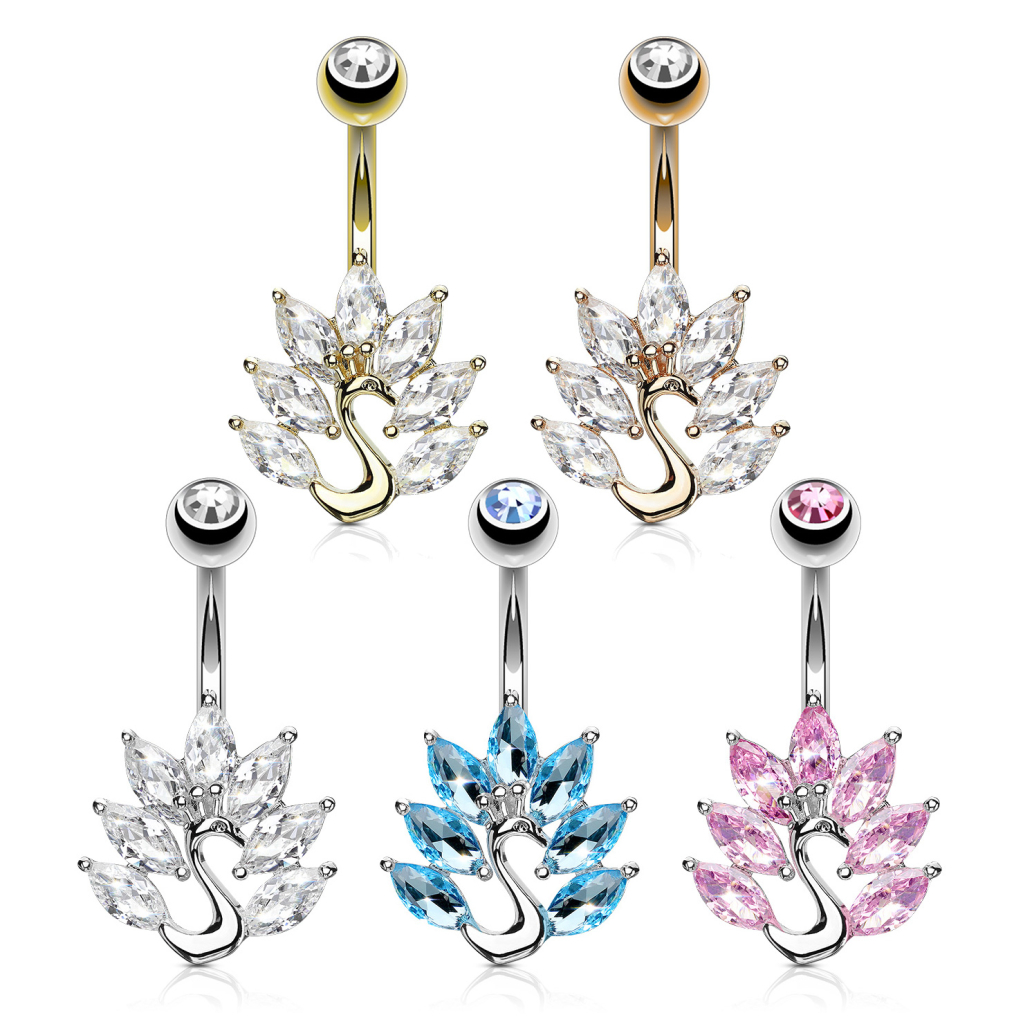 Ce piercing au nombril représente un paon. Le paon a, avec ses pierres marquises, une queue entièrement plissée qui fait partie d'une période sexuelle, où les mâles s'intimident. En général, un mâle a entre 100 et 150 plumes de queue, avec ce piercing, tu auras sept pièces en pierre.