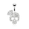 Voici un bijou très doux pour ton piercing au nombril avec un crâne qui brille comme une poignée de diamants. Les brillants de ce crâne sont blancs et sont si rapprochés qu’ils recouvrent toute sa surface, à l’exception des trous pour les yeux et le nez. Ses yeux sont deux très grands trous, tandis que son nez a une curieuse forme de triangle.