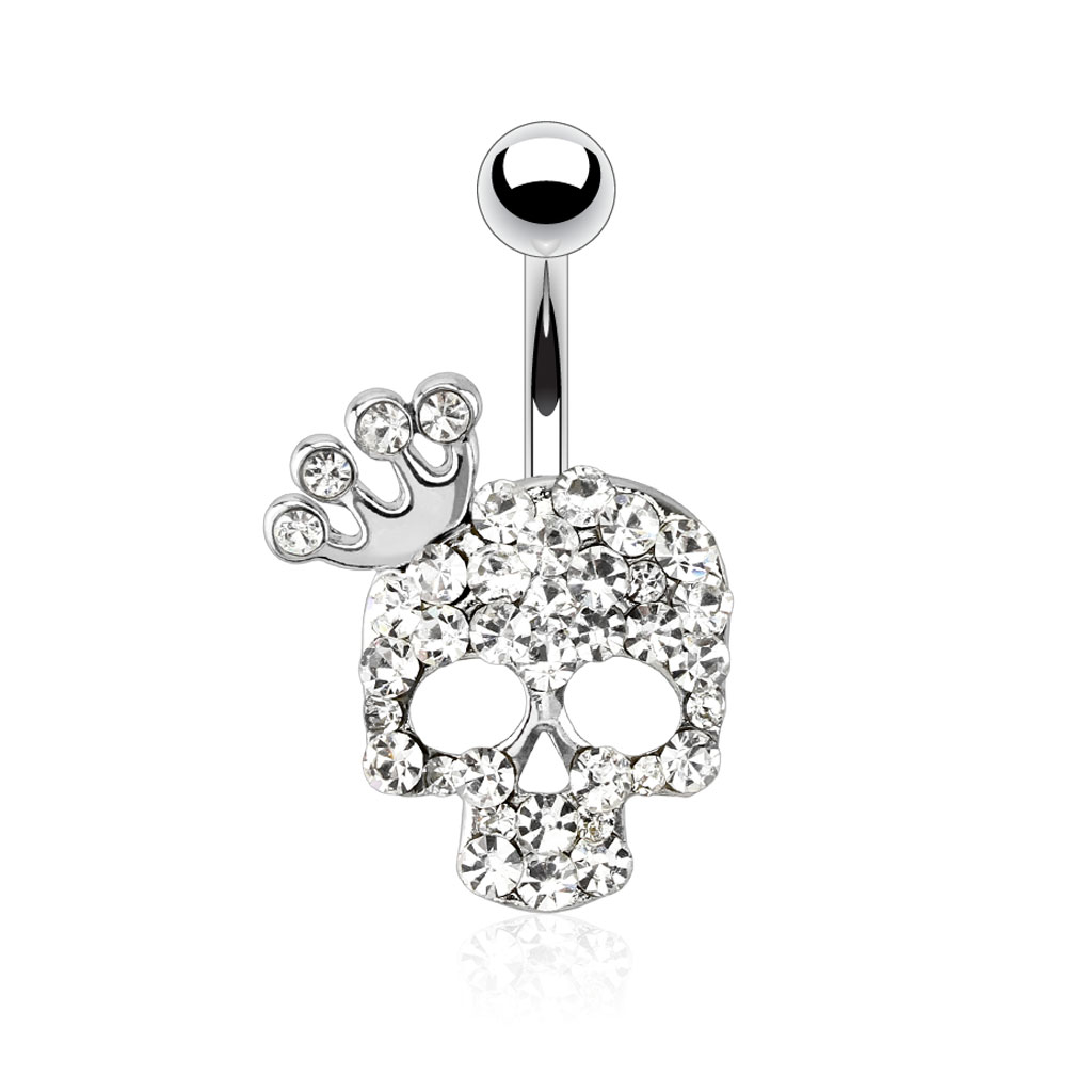 Voici un bijou très doux pour ton piercing au nombril avec un crâne qui brille comme une poignée de diamants. Les brillants de ce crâne sont blancs et sont si rapprochés qu’ils recouvrent toute sa surface, à l’exception des trous pour les yeux et le nez. Ses yeux sont deux très grands trous, tandis que son nez a une curieuse forme de triangle.