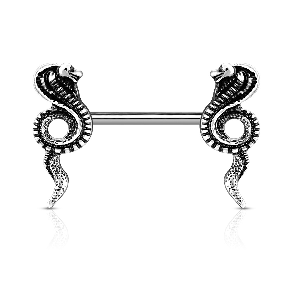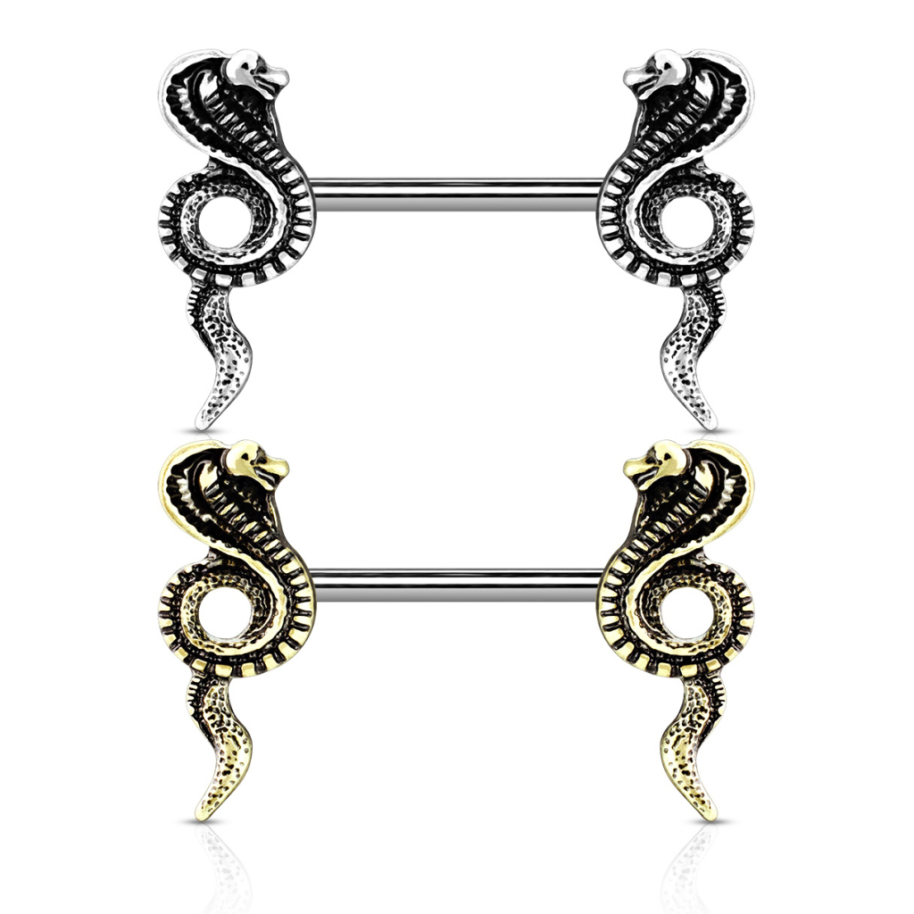 Ces bijoux n'ont rien de classique. Ils sont très originaux et polyvalents. Ils ont une tige avec une boule à chaque extrémité. Mais ce qui les différencie, ce sont les cobras qu'il y a au bout de chaque boule. Ils sont destinés à être utilisés dans la poitrine et uniquement là. La conception des bijoux rend l’utilisation difficile à un autre endroit, comme à la langue par exemple.