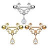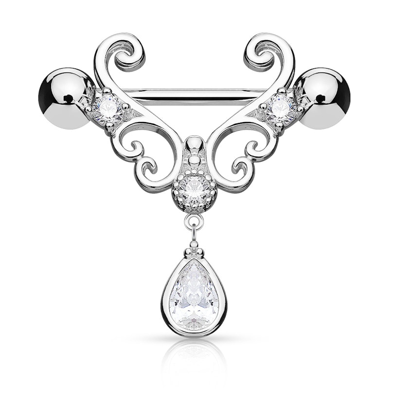 Ce bijou est magnifique lorsqu'il est placé dans le piercing du mamelon, il est irrésistible, car sa forme adorable enveloppe le mamelon de manière impressionnante. Il contient 4 brillants, dont 3 sont placés à chaque extrémité du demi-carré formant la structure du bijou, le dernier étant suspendu au brillant inférieur et ayant la forme d'une goutte. De plus, de chaque côté de la place, se trouve le contour d’un beau cœur qui, avec les formes ondulées de la partie supérieure et en général l’ensemble du bijou, forme un bijou exceptionnel.