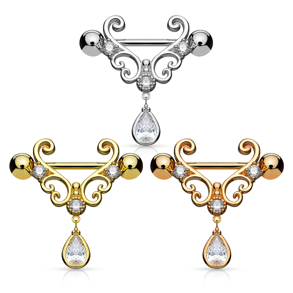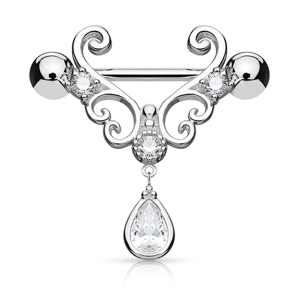 Ce bijou est magnifique lorsqu'il est placé dans le piercing du mamelon, il est irrésistible, car sa forme adorable enveloppe le mamelon de manière impressionnante. Il contient 4 brillants, dont 3 sont placés à chaque extrémité du demi-carré formant la structure du bijou, le dernier étant suspendu au brillant inférieur et ayant la forme d'une goutte. De plus, de chaque côté de la place, se trouve le contour d’un beau cœur qui, avec les formes ondulées de la partie supérieure et en général l’ensemble du bijou, forme un bijou exceptionnel.
